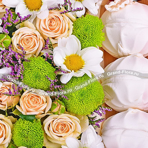 Стандартный: хризантема кустовая зеленая - 2шт., роза кустовая кремовая - 5 шт., хризантема кустовая белая - 3 шт., лимониум(статица) - 3шт., декоративная зелень, зефир, оазис, коробка.