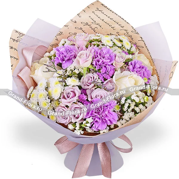 Люкс: роза белая - 3 шт., роза кустовая фиолетовая - 2 шт., гвоздика фиолетовая - 4 шт., хризантема сантини - 2 шт., хризантема кустовая ромашковая фиолетовая - 4 шт., статица, упаковка, лента. Примерный размер: 40Х40 см.